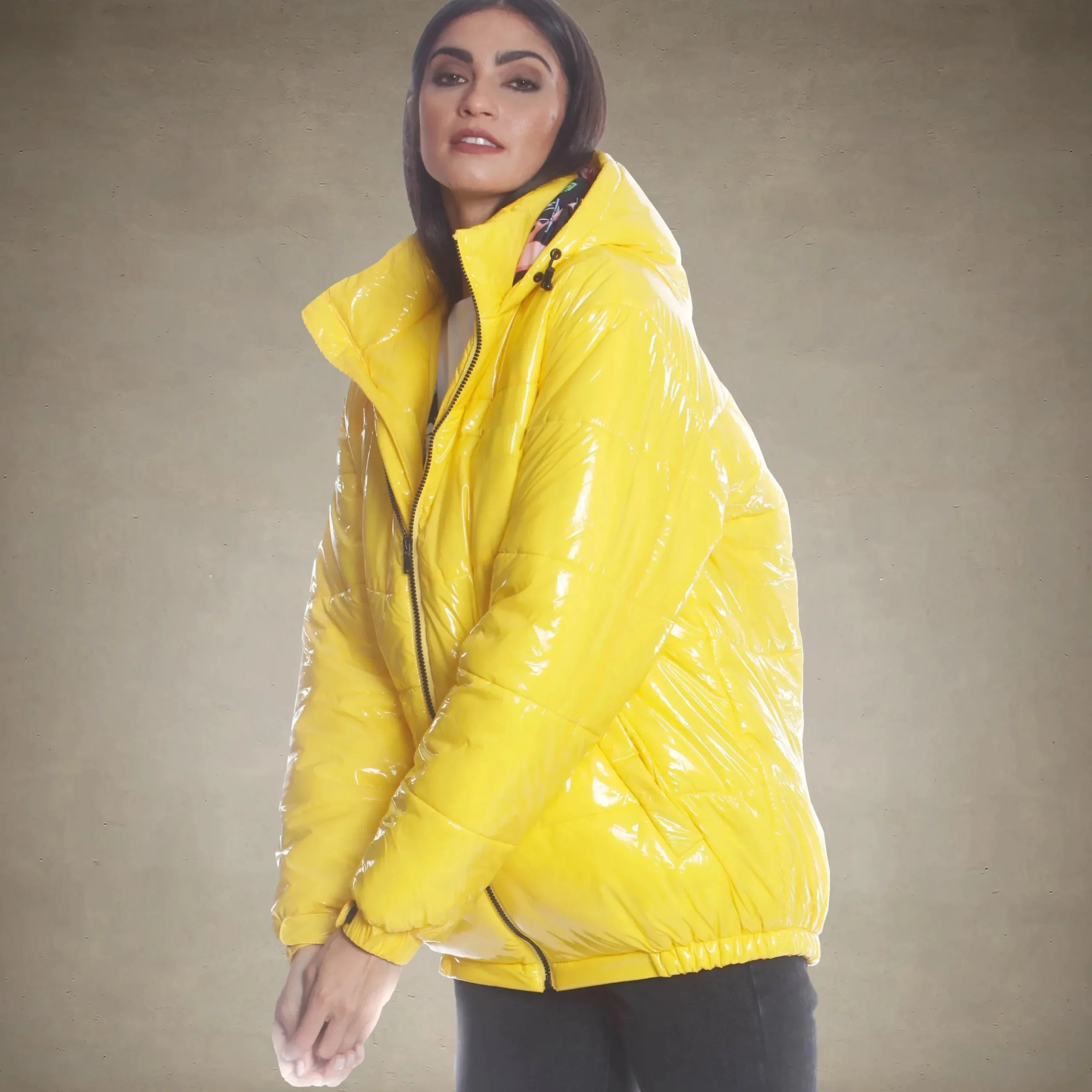 The Members Only Women’s Hi-Shine Chevron Quilt Puffer Jacket in Nickelodeon print combines contemporary style with nostalgic flair. Featuring a sleek, glossy finish, this jacket stands out with its high-shine fabric that adds a modern touch to your winter wardrobe. The chevron quilted pattern not only enhances its chic appearance but also provides superior insulation for warmth and comfort. Adorned with vibrant Nickelodeon-themed graphics, it brings a playful, retro vibe to your cold-weather gear. Designed for both style and functionality, it includes a full-length zipper, ribbed cuffs, and a stand-up collar to keep the chill out. Perfect for fans of the iconic network, this puffer jacket offers a unique way to showcase your personality while staying cozy.